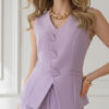 Chaleco lila de corte estructurado que estiliza la silueta con un aire elegante y moderno. Presenta escote en “V” y un diseño entallado que define la cintura, resaltando la figura con sofisticación. Sus delicados detalles frontales tipo pétalo aportan un toque femenino y distintivo, mientras que la confección en tela firme y suave garantiza una caída impecable.